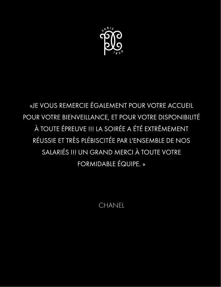 From the creation of menus to the selection of seasonal products, our chefs imagine contemporary, generous and demanding cuisine, designed to enhance every moment of the meal. We choose to work as in the past, maintaining the gestures, time and precision that are the hallmarks of French gastronomy. Here, everything is entirely homemade. We support all events, from the most intimate to the largest formats, with constant demand, supported by committed, creative teams recognized for their sense of detail.